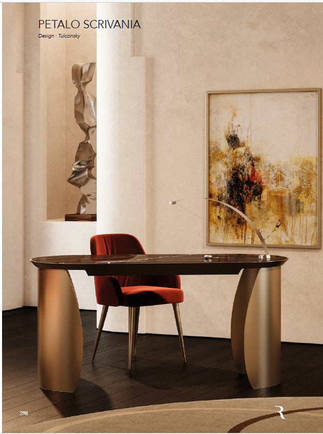 Bases in Extra-clear curved glass in satin Brass 104M finishing Bevel-MarmoReflex top in Sahara with edge in Bronze 100M finish With drawer – 160 x 65 x 77 h